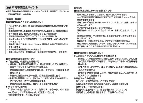 そこで、資料ページには、“運行管理者の業務” “点呼の実施” “交替運転者の配置基準” など、バスの運行管理に必要な法令や、”車内事故防止ポイント”、”居眠り運転防止策”など、知っておきたい知識を厳選し「法令編」「知識編」「データ編」としてわかりやすく1冊にまとめました。