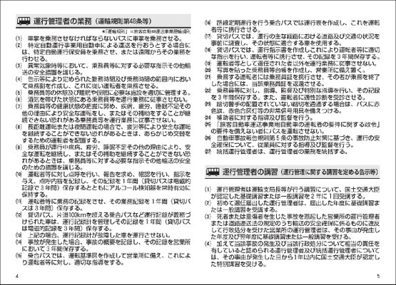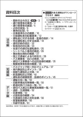 本手帳は、バス事業所の運行管理者として知っておきたい知識を「法令編」「知識編」「データ編」にまとめて資料ページに収録しています。