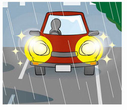雨で視界が悪くなるので早めに点灯して、自車を目立たせましょう。