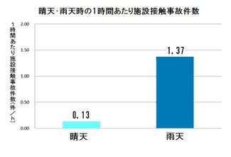 晴天時に比べ、雨天時の1時間あたりの施設接触事故発生件数は約10倍となっています。