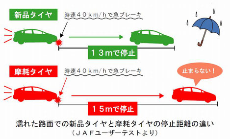 摩耗したタイヤを放置していると、濡れた路面では停止距離が長くなって非常に危険です(下図参照)。