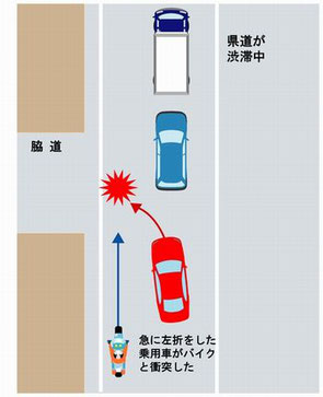このとき県道は渋滞していて、乗用車は脇道に入ろうとして左にハンドルを切ったときにバイクと衝突したということで、左後方をよく確認しないで曲がろうとしたものと思われます。