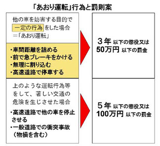 また、 高速道路の本線上で相手の車を停止させたり、一般道路であっても物損事故を起こさせるなどの著しい危険を生じさせた場合は、より重い5年以下の懲役または100万円以下の罰金とする方向で検討しています。