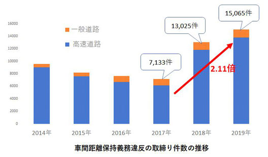 2017年に東名高速道路であおり運転に起因した悲惨な死亡事故が発生して社会問題化したことなどを受けて、警察庁が取締りを強化した結果です。2017年の 6,139件と比べて、2.11倍に増えています。